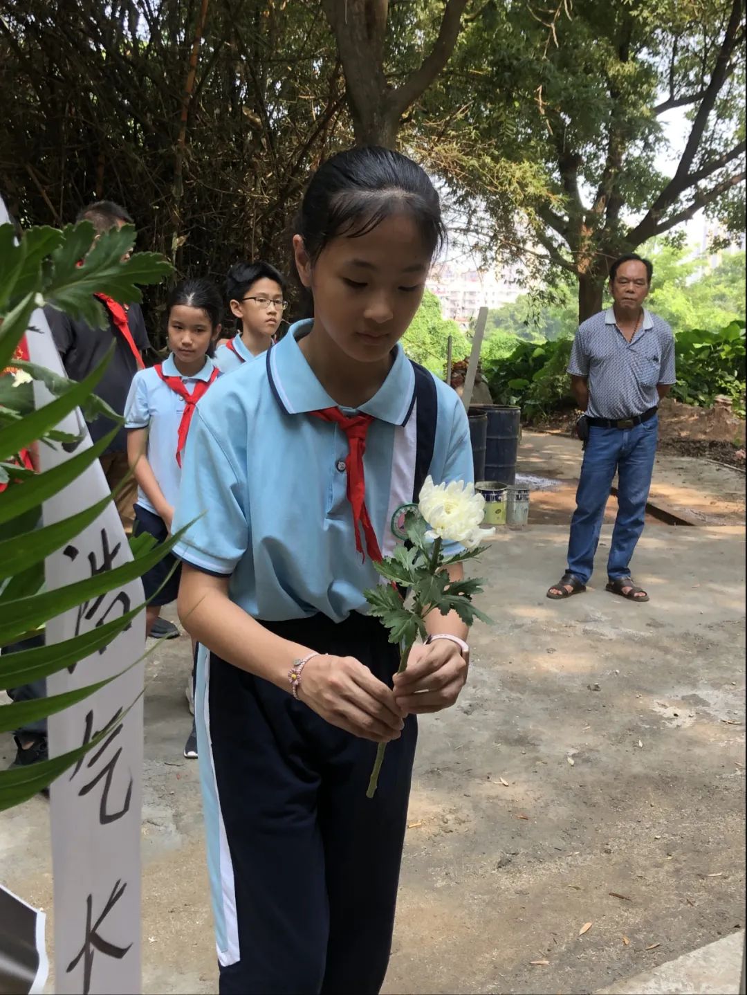 ▲在沙溪鎮(zhèn)黨委委員李海龍、副鎮(zhèn)長候選人余添宏帶領下,按順序依次向楊麗容烈士雕塑獻花。