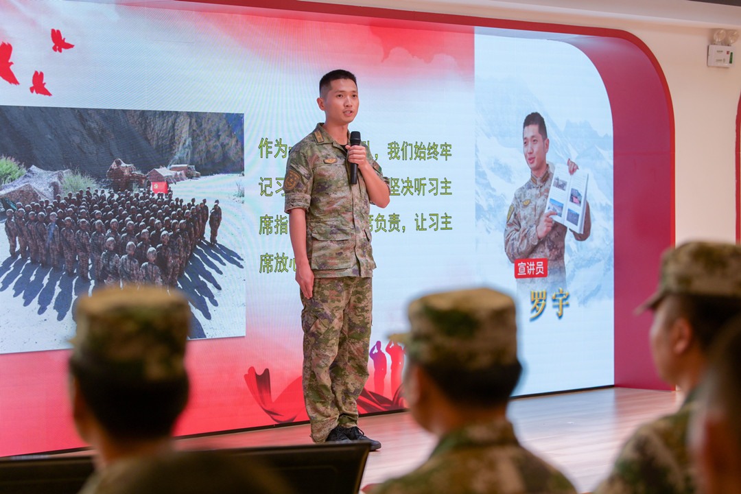 現(xiàn)場,新疆高原69316部隊邊防一營副政治教導(dǎo)員、優(yōu)秀共產(chǎn)黨員羅宇,中國人民解放軍91878部隊上尉干事郭開強,69316部隊邊防三營五連一班班長張長城3位部隊宣講員激情開講,分享感人的軍旅故事。  羅宇分享軍旅故事。記者 易承樂 攝