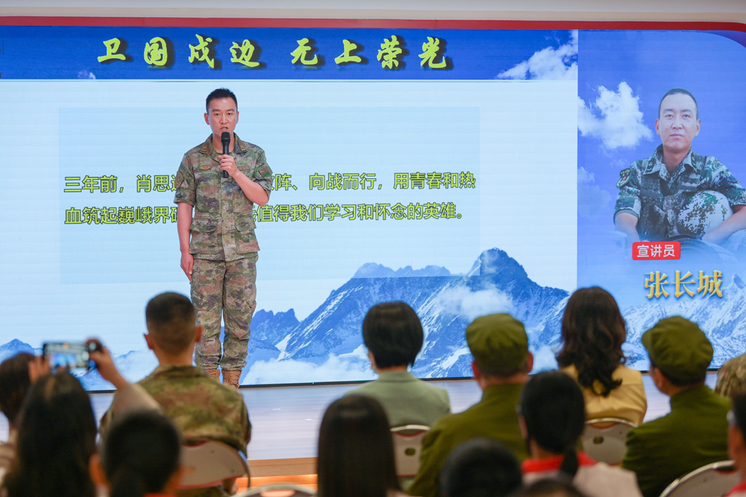張長城:肖思遠的名字永遠留在連隊 “我是69316部隊加勒萬邊防連‘肖思遠班’班長張長城,很高興今天有機會跟大家進行交流。三年前,肖思遠班長兩闖敵陣、向戰(zhàn)而行,用青春和熱血筑起巍峨界碑,是永遠值得我們學(xué)習(xí)和懷念的英雄……” 張長城現(xiàn)場作了主題為《衛(wèi)國戍邊 無上榮光》的宣講。 張長城說—— 肖班長犧牲后,連隊組建了“肖思遠班”,班里有一張肖班長的床,每天晚上,戰(zhàn)士們都會將肖班長的被子打開,早上起床再將被子工工整整的疊好;晚上點名,班里的同志輪流向肖班長匯報本班和個人的工作。 連隊每天的點名,呼點的第一個名字永遠是“肖思遠”,全連齊聲答“到、到、到”,那一刻,感覺下面所有人,望過去都是他! ▌與現(xiàn)場基層干部群眾互動交流