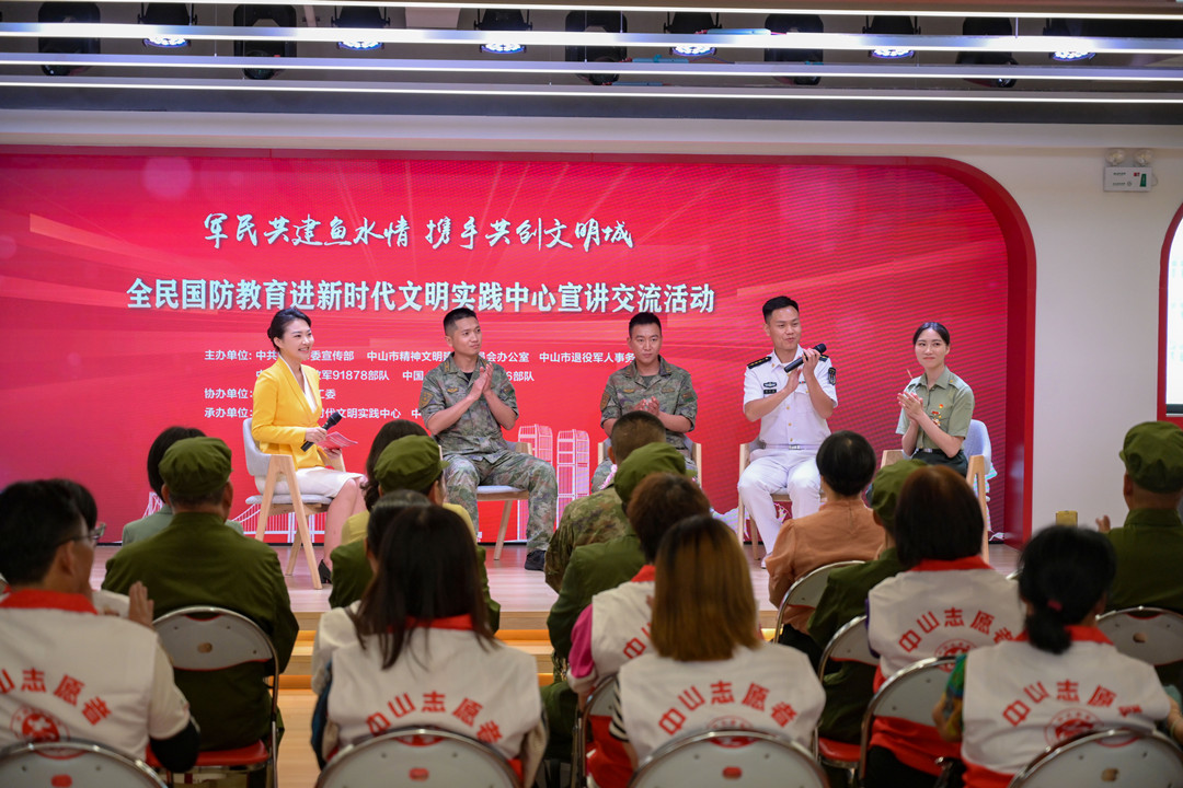 5月18日下午,全民國防教育進新時代文明實踐中心宣講交流活動在中山市民眾街道新時代文明實踐中心舉行,退役軍人代表、基層群眾、村干部以及受邀出席的中國人民解放軍91878部隊、69316部隊官兵代表等200余人參加活動。  活動現(xiàn)場。記者 易承樂 攝