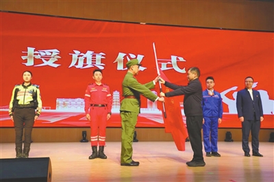 “戎耀香山”老兵宣講工作室負責(zé)人李克在中山市“理響興中”宣講團授旗儀式上接旗。(資料圖片)