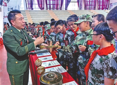 林東小學(xué)師生興致勃勃參觀移動軍旅展覽館紅色收藏品。