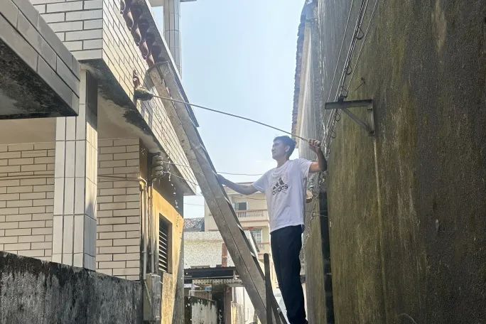 “阿姨,您家樓頂積了水,容易孳生蚊蟲,得趕緊清掉。我們現(xiàn)在先幫您疏通一下排水口。” 在南朗街道蚊媒傳染病防控一線,左步村網(wǎng)格員、退伍軍人嚴兆雄跟村民溝通后,爬上長梯,用工具疏通天臺外墻排水口,讓積水迅速排走,從源頭阻斷蚊蟲孳生。