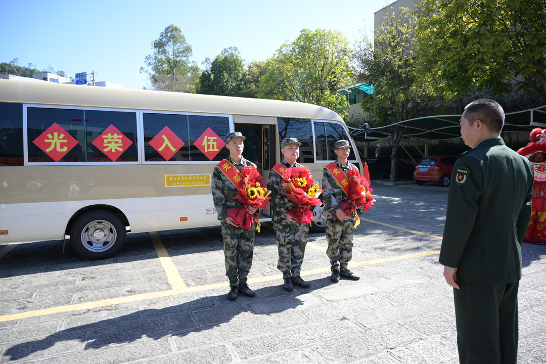 葉陽浩、胡家威兩名準新兵身披“光榮入伍”的紅色綬帶和大紅花昂首挺胸站在太陽下,新兵家屬前來歡送。“陽浩的堂叔叔、外公和叔公都曾應(yīng)征入伍,他能進部隊得到鍛煉,我們作為他的父母感到很光榮、很幸福。”葉陽浩的父母胸戴“光榮家屬”的大紅花,露出激動的笑容。