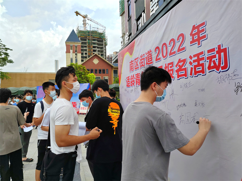體檢現(xiàn)場,南區(qū)街道嚴格按照標準設置,通過懸掛征兵標語、張貼海報、使用LED屏播放征兵宣傳片等方式,營造濃厚氛圍。事前,南區(qū)街道征兵辦嚴格落實常態(tài)化疫情防控要求,提前收集、核查好參檢青年的粵康碼、行程卡、核酸檢測證明等,并對體檢場所進行全面消毒處理,保持體檢站分離通風。參檢人員全程佩戴口罩,分批分流進行體檢,確保體檢工作平穩(wěn)有序開展。  ▲適齡青年參加體檢簽名