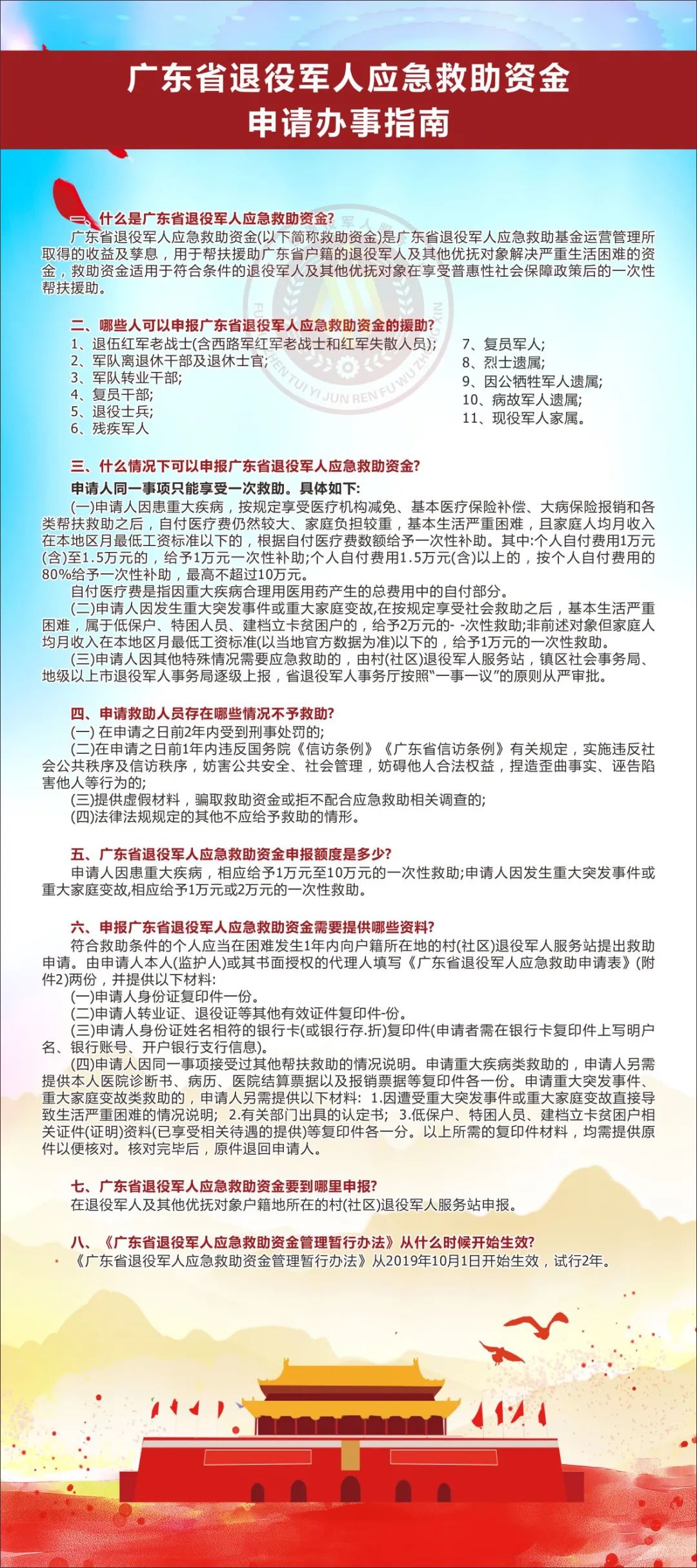 廣東省退役軍人應(yīng)急救助資金自2019年7月設(shè)立以來,為我市退役軍人及其他優(yōu)撫對象提供了有力的幫扶援助。 其救助類型主要分為四類:申請人因患重大疾病、發(fā)生重大突發(fā)事件、發(fā)生重大家庭變故或其他特殊情況導(dǎo)致基本生活嚴(yán)重困難的。符合條件的申請人可向戶籍地所在的村(社區(qū))退役軍人服務(wù)站進(jìn)行申請。 |