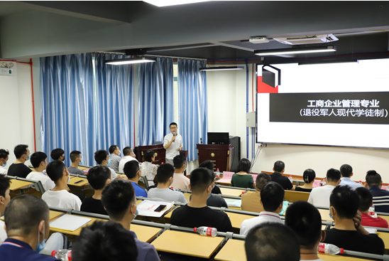 “狹路相逢勇者勝,在座的各位從繁忙的工作崗位上走出來,邁出繼續(xù)學(xué)習(xí)的關(guān)鍵一步,勇氣可嘉。三年后,相信大家一定會收獲知識、技能、學(xué)歷,更好地開啟新征程。”退役軍人現(xiàn)代學(xué)徒制項(xiàng)目開學(xué)典禮上,經(jīng)管學(xué)院院長肖紅在致辭中對新生們表示歡迎和祝賀,并表達(dá)了殷切期望,希望大家在求學(xué)期間,修德修身、克勤克儉、心懷理想,腳踏實(shí)地,融入多姿多彩的校園生活,在學(xué)生當(dāng)中彰顯軍人本色和榜樣力量。 市退役軍人事務(wù)局相關(guān)負(fù)責(zé)人對項(xiàng)目順利開班表示祝賀,對學(xué)院在項(xiàng)目申報、招生等工作中的辛勤付出表示衷心感謝。他介紹了項(xiàng)目實(shí)施的背景,指出開展退役軍人現(xiàn)代學(xué)徒制教育,是退役軍人安置工作的一項(xiàng)重要內(nèi)容,通過現(xiàn)代學(xué)徒制,讓大家成為全日制大學(xué)生,進(jìn)行正規(guī)系統(tǒng)的高等職業(yè)教育,是黨和政府送給同學(xué)們的一份沉甸甸的“大禮包”。同時,要求新生們盡快適應(yīng)由士兵到大學(xué)生的角色轉(zhuǎn)變,勤學(xué)善思,掌握就業(yè)創(chuàng)業(yè)本領(lǐng),發(fā)揚(yáng)軍隊(duì)能打勝仗的優(yōu)良傳統(tǒng),爭創(chuàng)佳績,為祖國和地方經(jīng)濟(jì)建設(shè)再立新功。 學(xué)院工商管理專業(yè)主任沈孟康介紹了學(xué)校和學(xué)院概況,就學(xué)生日常管理、教學(xué)內(nèi)容、方式和計劃等作詳細(xì)說明。表示學(xué)校將采取在崗培養(yǎng)與學(xué)校培養(yǎng)相結(jié)合,堅(jiān)持“標(biāo)準(zhǔn)不降、模式多元、學(xué)制靈活”,線上與線下混合教學(xué),實(shí)行工學(xué)交替、靈活多元的教學(xué)模式。經(jīng)管學(xué)院已配備了教授、博士等“精銳”師資團(tuán),“量身定制”人才培養(yǎng)方案,全力保障“八一班”的教育教學(xué)質(zhì)量。
