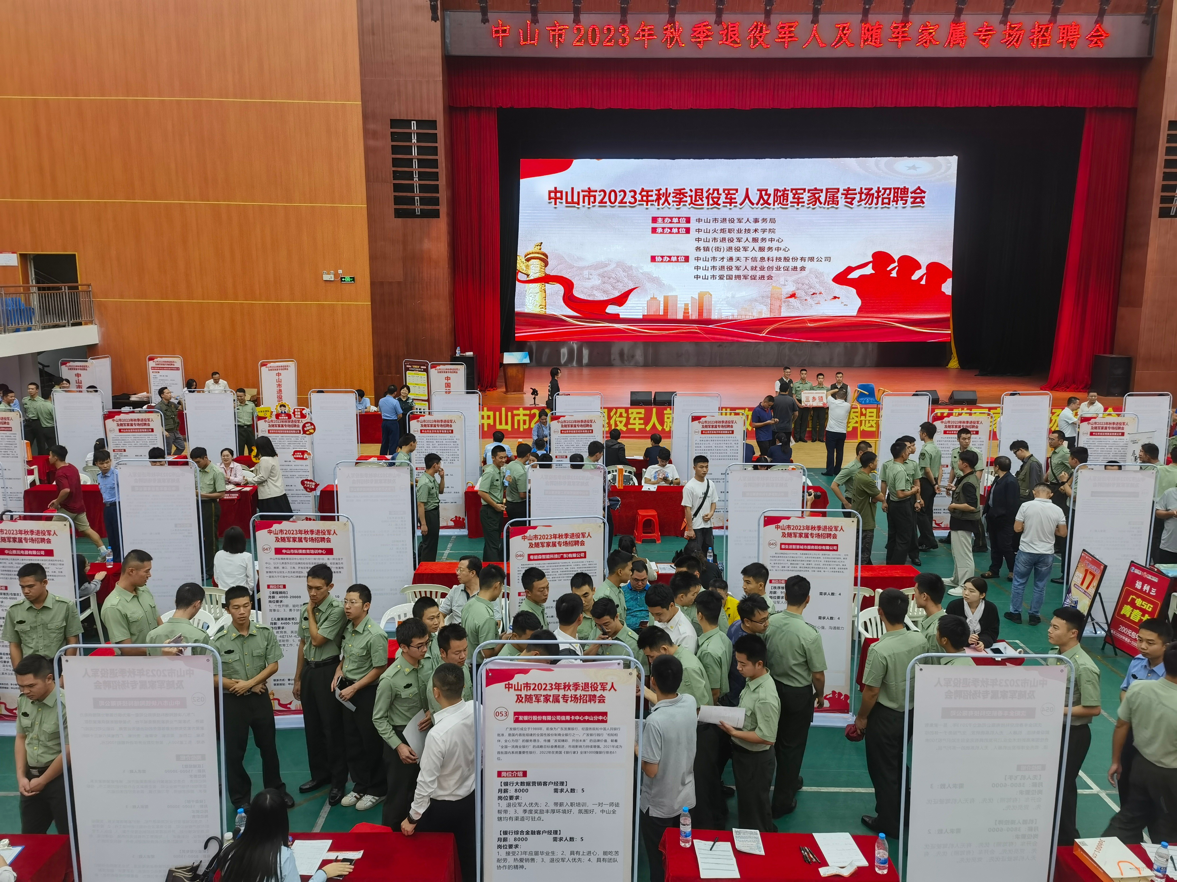 中山市2023年秋季退役軍人及隨軍家屬專場招聘會(huì)現(xiàn)場。(市退役軍人事務(wù)局供圖) 為深入開展“我為群眾辦實(shí)事”實(shí)踐活動(dòng),推動(dòng)主題教育走深走實(shí)、見行見效,10月20日下午,中山市2023年秋季退役軍人及隨軍家屬專場招聘會(huì)在中山火炬職業(yè)技術(shù)學(xué)院體育館成功舉辦。專場招聘會(huì)由中山市退役軍人事務(wù)局主辦,中山火炬職業(yè)技術(shù)學(xué)院、中山市退役軍人服務(wù)中心、各鎮(zhèn)(街)退役軍人服務(wù)中心承辦,中山市才通天下信息科技股份有限公司、中山市退役軍人就業(yè)創(chuàng)業(yè)促進(jìn)會(huì)、中山市愛國擁軍促進(jìn)會(huì)協(xié)辦。