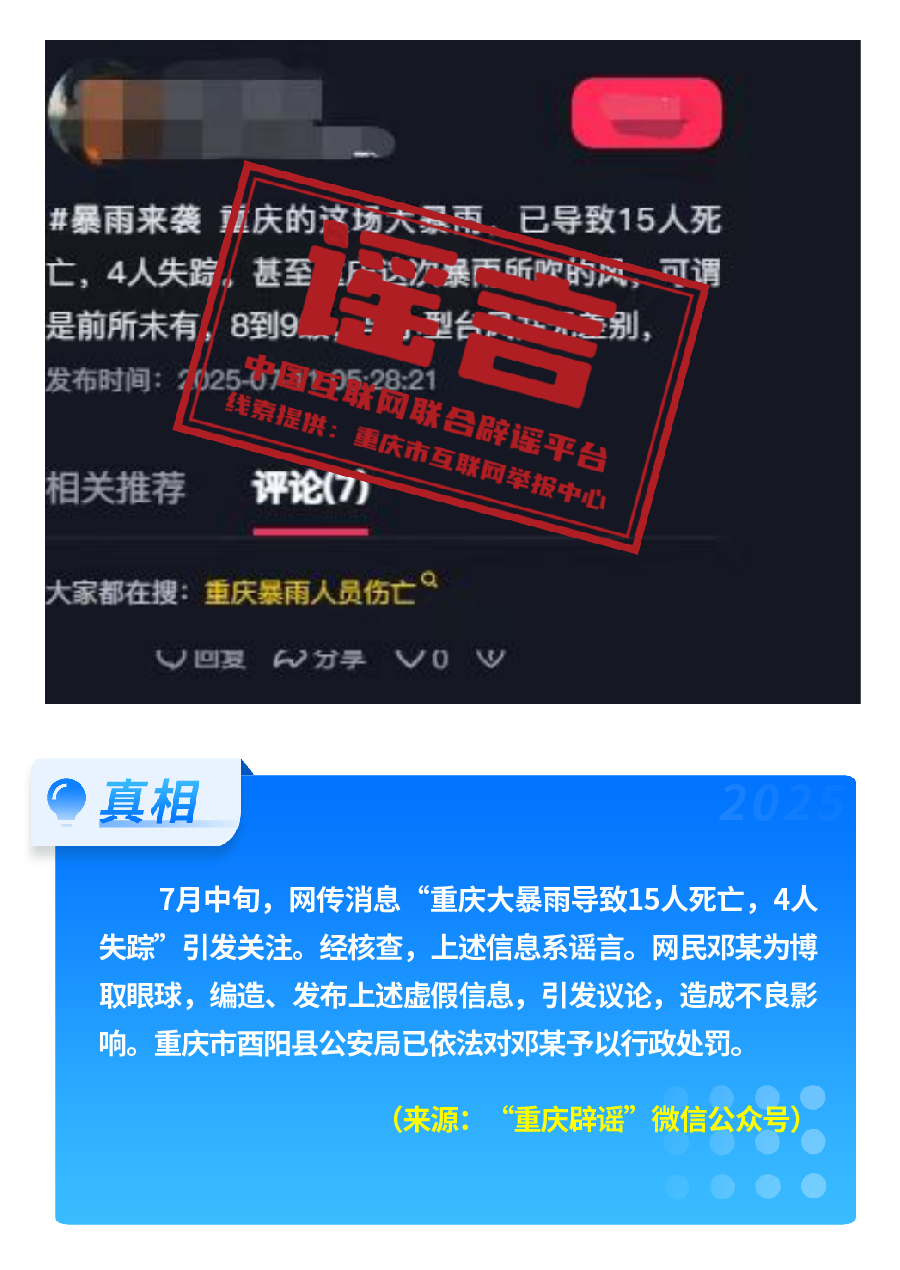 近期,網(wǎng)上接連出現(xiàn)發(fā)布虛假“警情通報(bào)”的惡性造謠傳謠案件,炮制傳播“昆明駕車(chē)撞人案131人死亡”“杭州自來(lái)水接入糞水”及涉釋永信虛假“警情通報(bào)”,模仿“藍(lán)底白字”格式,杜撰聳人聽(tīng)聞細(xì)節(jié),損害政府公信力,嚴(yán)重?cái)_亂社會(huì)秩序?!霸菏款A(yù)測(cè)廣東將發(fā)生8級(jí)以上大地震”公然偽造專(zhuān)家聊天截圖,謊報(bào)地震預(yù)警。還有造謠者借盛夏高溫酷暑與洪澇災(zāi)害,編造“安徽淮北、山東泰安等地多人因高溫死亡” “重慶大暴雨導(dǎo)致15人死亡、4人失蹤”等謠言,蹭炒熱點(diǎn)、煽動(dòng)情緒。