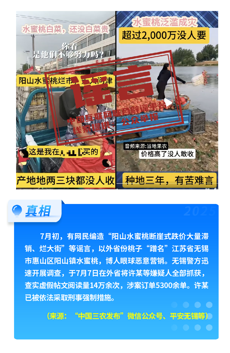此外,7月份正值暑期旅游旺季和水果等農(nóng)產(chǎn)品收獲季,有自媒體、商家借機(jī)編造傳播涉文旅及農(nóng)產(chǎn)類(lèi)謠言,干擾市場(chǎng)秩序,侵害消費(fèi)者權(quán)益。有商家違規(guī)使用人民大會(huì)堂建筑圖片標(biāo)識(shí)和名稱(chēng),仿冒人民大會(huì)堂賬號(hào),非法售賣(mài)、倒賣(mài)參觀門(mén)票,損害游客權(quán)益。個(gè)別商家剪輯發(fā)布“江蘇無(wú)錫陽(yáng)山水蜜桃斷崖式跌價(jià)、大量滯銷(xiāo)、爛大街”謠言視頻,再借機(jī)兜售假冒的陽(yáng)山水蜜桃,博人眼球惡意營(yíng)銷(xiāo),擾亂市場(chǎng)秩序。所謂“峨眉山人猴大戰(zhàn),游客墜崖,猴王被當(dāng)場(chǎng)擊斃”景區(qū)安全事件一度傳得沸沸揚(yáng)揚(yáng),相關(guān)視頻以驚悚情節(jié)博取關(guān)注,畫(huà)面實(shí)際是用AI合成拼接制作。
