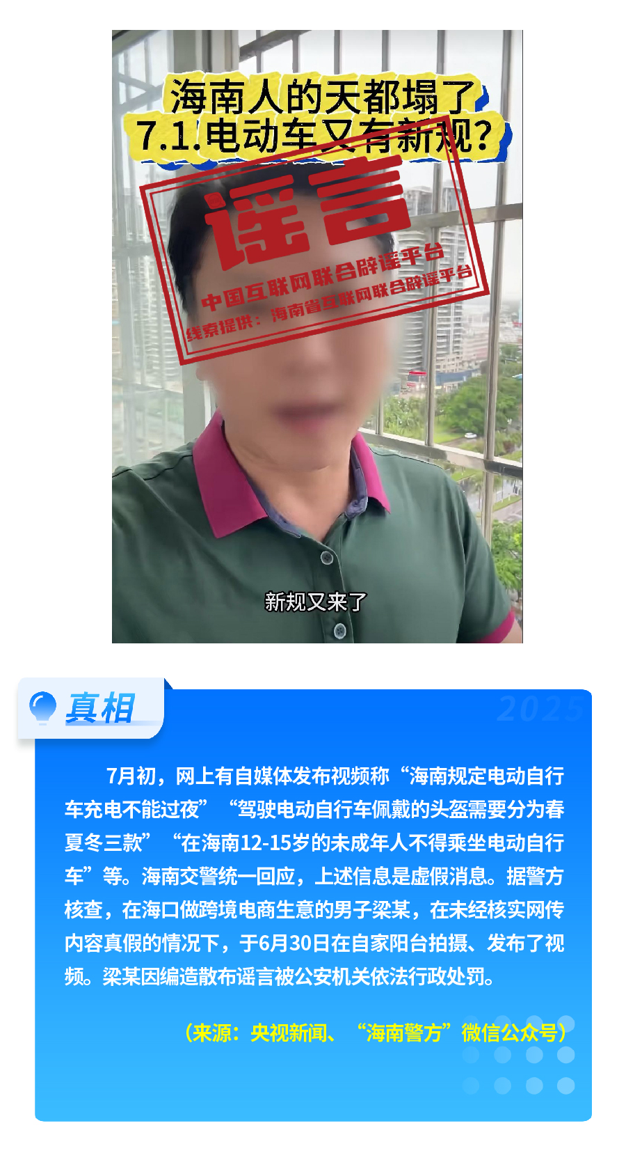 有人重新翻炒“醫(yī)?!畟€(gè)人賬戶(hù)’將全部取消”舊謠,故意歪曲醫(yī)保改革真實(shí)內(nèi)涵,嚴(yán)重誤導(dǎo)公眾對(duì)醫(yī)保改革政策的理解。“有專(zhuān)人上門(mén)服務(wù)激活醫(yī)保碼”,披著“公共服務(wù)”的外衣,實(shí)有詐騙之嫌和安全風(fēng)險(xiǎn)。憑空捏造“海南規(guī)定電動(dòng)自行車(chē)充電不能過(guò)夜、頭盔分三季”這一“奇葩規(guī)定”,以“新規(guī)”話(huà)術(shù),擾亂交通管理秩序。