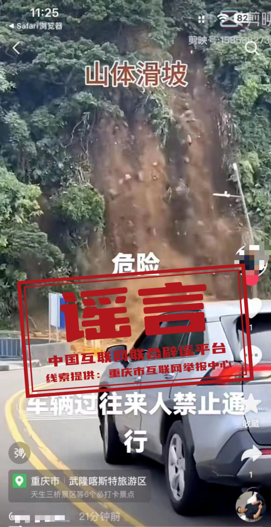 真相:近日,有網(wǎng)民發(fā)布了一則“山體滑坡危險(xiǎn),過(guò)往車輛行人禁止通行”的視頻,視頻定位標(biāo)注為“重慶市武隆喀斯特旅游區(qū)”。經(jīng)重慶市武隆區(qū)多部門(mén)核實(shí),該區(qū)近期未發(fā)生大面積山體滑坡事件。網(wǎng)傳視頻實(shí)為2024年6月3日臺(tái)灣省基隆市中正區(qū)潮境公園入口發(fā)生的大規(guī)模山體滑坡事件,而視頻中所標(biāo)注的定位信息系網(wǎng)民發(fā)布視頻的地點(diǎn),而非事件發(fā)生的地點(diǎn)。(來(lái)源:“重慶辟謠”微信公眾號(hào)、網(wǎng)信武?。?/span>