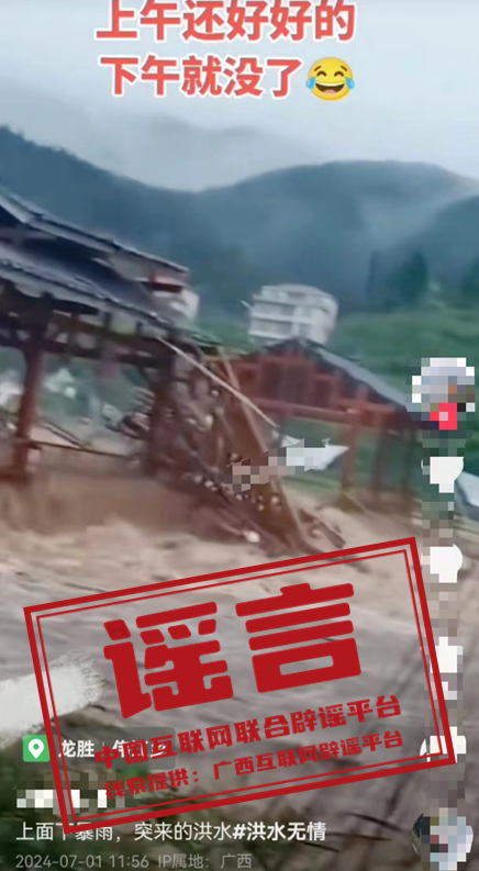 詳情:近日,有網(wǎng)民發(fā)布視頻稱“桂林龍勝一風(fēng)雨橋被洪水沖毀”,并配文“上午還好好的,下午就沒(méi)了”,引發(fā)關(guān)注。經(jīng)當(dāng)?shù)毓膊块T(mén)核實(shí),偉江鄉(xiāng)轄區(qū)內(nèi)風(fēng)雨橋完好無(wú)損,不存在倒塌的情況。該視頻系當(dāng)?shù)鼐W(wǎng)民龍某某罔顧事實(shí)、故意編造,將網(wǎng)上看到的其他地方的風(fēng)雨橋被毀視頻重新編輯并定位在偉江鄉(xiāng)進(jìn)行發(fā)布。目前,警方已依法對(duì)龍某某予以行政處罰。(來(lái)源:廣西互聯(lián)網(wǎng)辟謠平臺(tái)、龍勝公安)