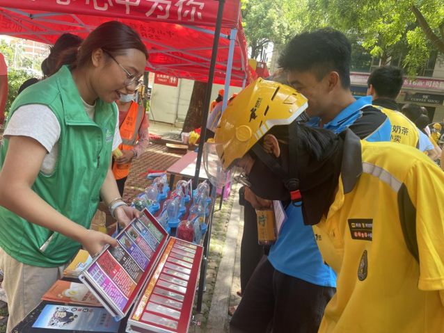 活動(dòng)伊始,梁主席為活動(dòng)致辭并給60余名外賣騎手送上夏日清涼飲料及防暑物資,對(duì)外賣騎手日常辛苦付出表達(dá)衷心感謝與深情慰問?;顒?dòng)設(shè)置宣傳攤位,外賣騎手與居民群眾駐足攤位前,認(rèn)真聆聽、觀看。禁毒志愿者為大家耐心講解新型毒品的樣式及危害,并結(jié)合騎手配送場(chǎng)景,重點(diǎn)講解“毒駕”危害及可疑包裹識(shí)別技巧,強(qiáng)化職業(yè)群體防毒意識(shí),同時(shí)警示騎手嚴(yán)守驗(yàn)視制度,若發(fā)現(xiàn)異常訂單,請(qǐng)立即通過“一鍵報(bào)警”功能舉報(bào),防止涉毒食品或物資流入消費(fèi)者手中,共同筑牢外賣配送禁毒防線。